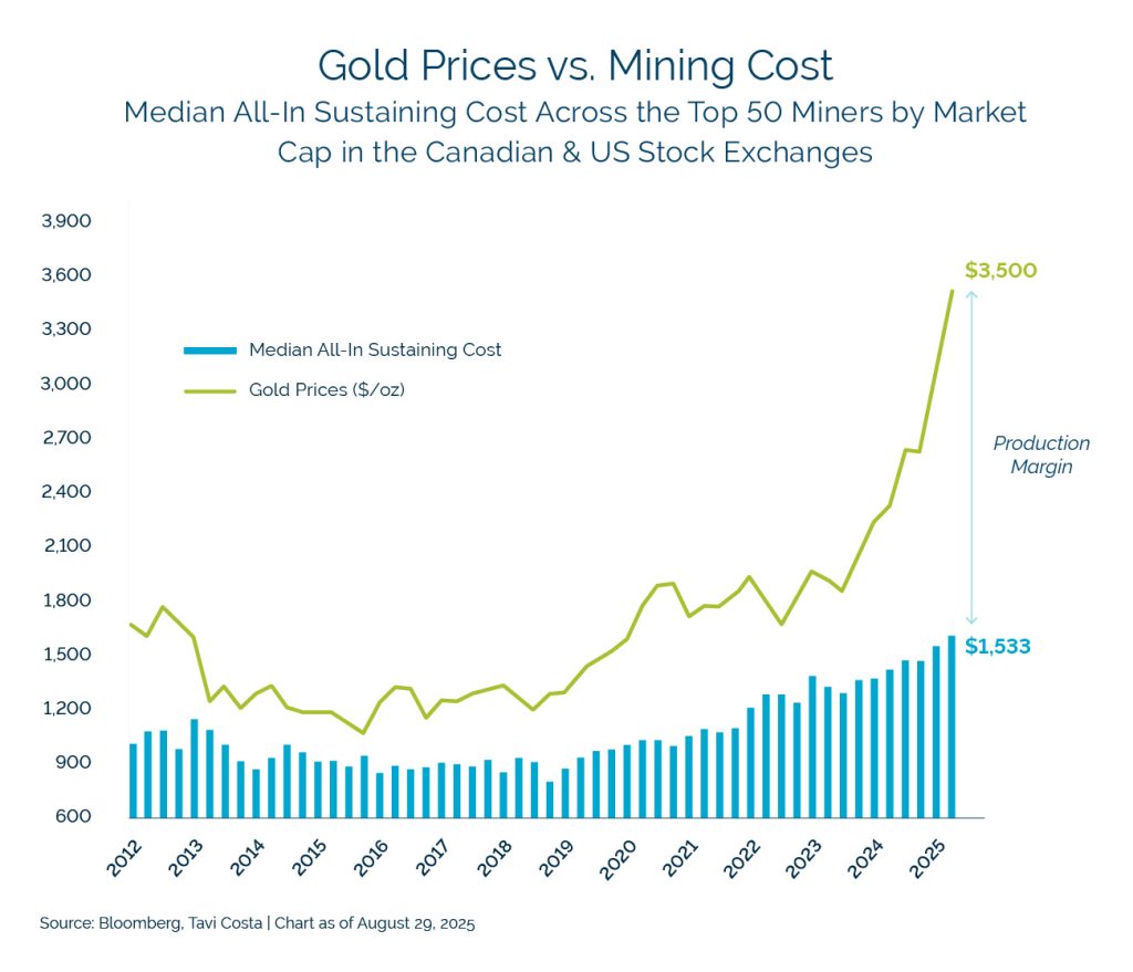 The price of gold has made gold mining companies the most profitable companies in the world. The profits below were at $3,500 per ounce and at the time of writing this newsletter, we are over $4,000 per ounce, so the margins are even greater now. (Source: Metals and Mining substack)